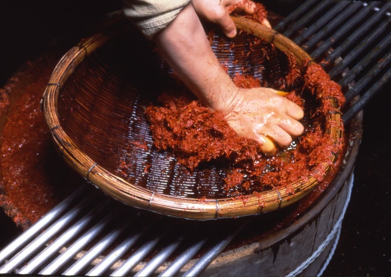 化粧用、あるいは絵具のように使うためには、色素を沈殿させて泥状にする。まず紅花から、紅色の色素を抽出する。それに米酢を加えて中性にする。そして、紅花は植物性繊維には色素がすぐに染まりつくが、いっぽうで放出することも早いという特徴を利用して、麻布または木綿布などの植物繊維にしみ込ませる。紅花の色素はアルカリ性で溶出するので、しみ込ませた麻布に藁灰から取った灰汁を加えて色素を揉み出す。かなり濃い紅花の液をつくるのである。そこへ