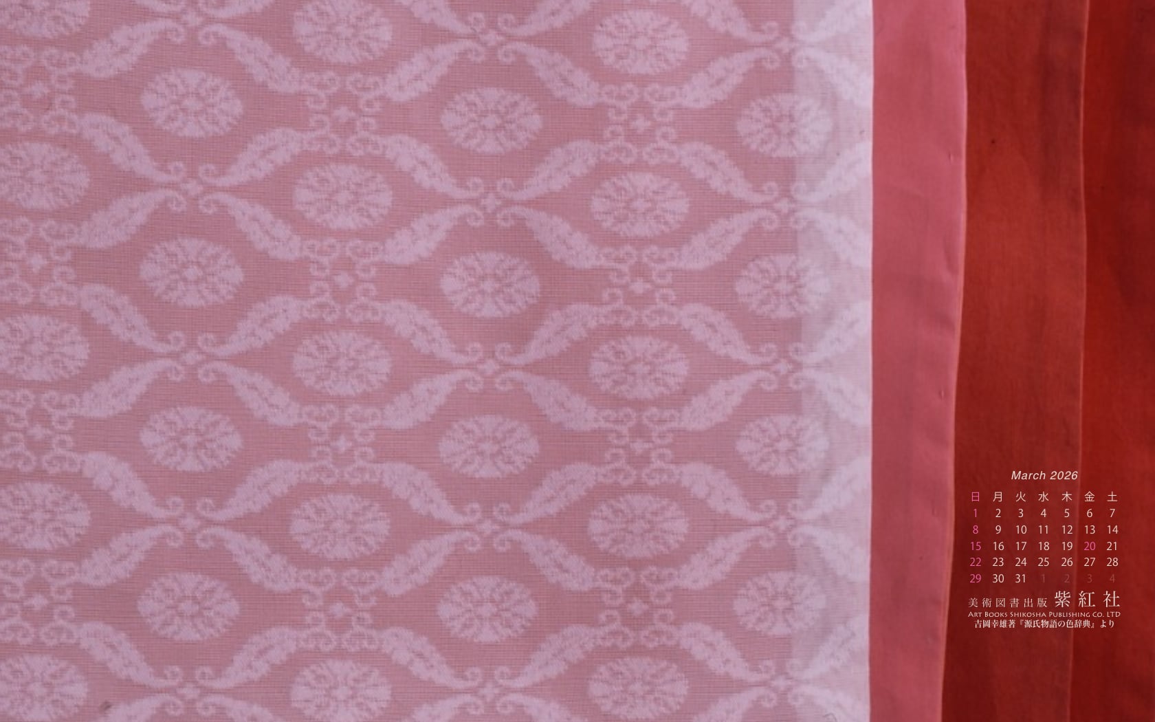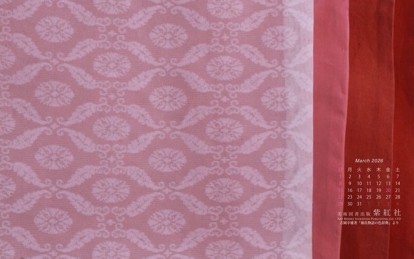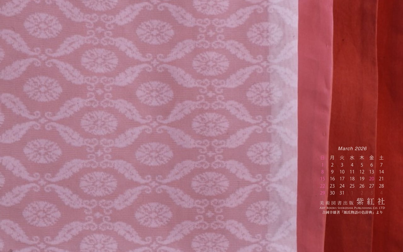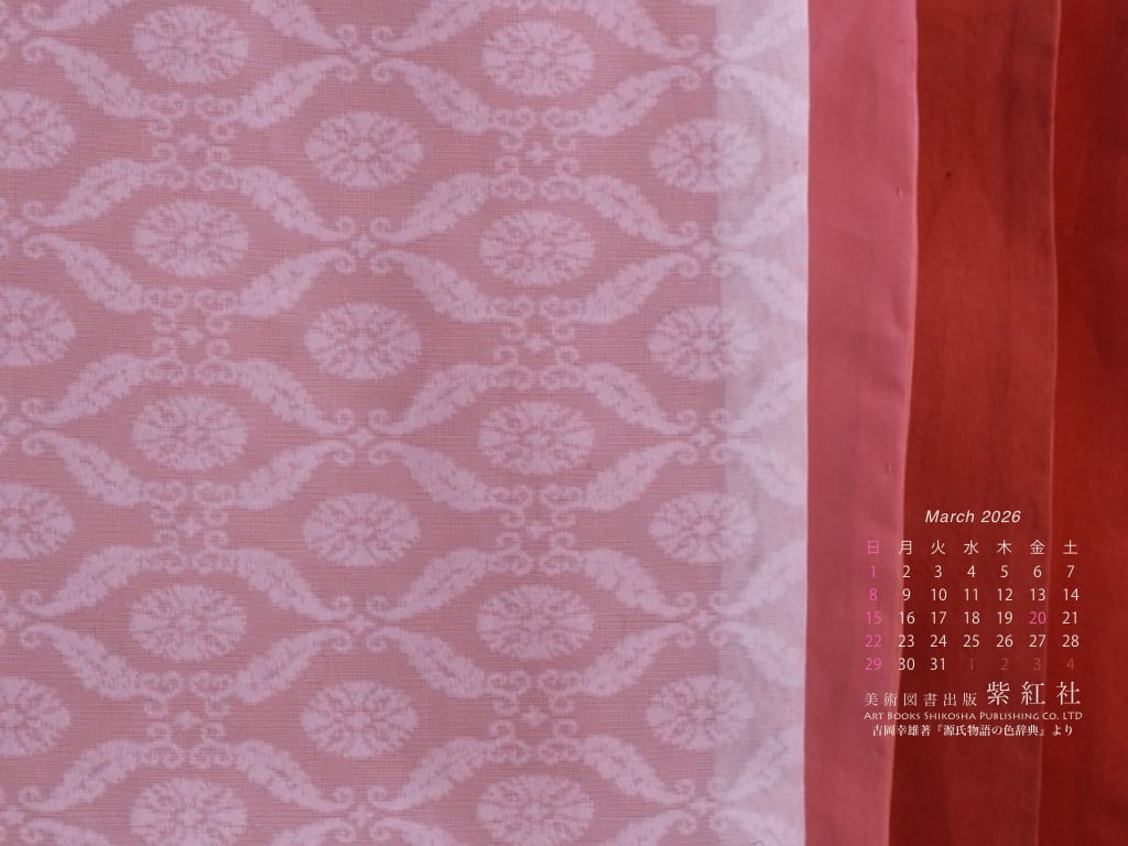 『源氏物語の色辞典』「若菜上」より「桜の細長」をデスクトップ壁紙にしました(染色:染司よしおか)。